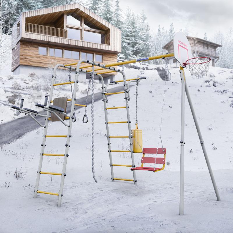 Спортивный дачный комплекс ROMANA Fitness - незаменимый помощник для активных детей, желающих заниматься спортом на свежем воздухе. Конструкция состоит из устойчивого металлического каркаса и нескольких элементов, включая ккачели, лестницу, баскетбольный щит с кольцом и сеткой, канат, рукоход, брусья со спинкой, гимнастические кольца с перекладиной, турник, боксёрскую грушу. Турник крепится к металлическим стойкам на любую высоту. Брусья и навесная спинка быстро и просто устанавливаются, в случаи необходимости также демонтируются. Все спортивные и игровые элементы служат отличным инструментом для развития ловкости, силы и гибкости.