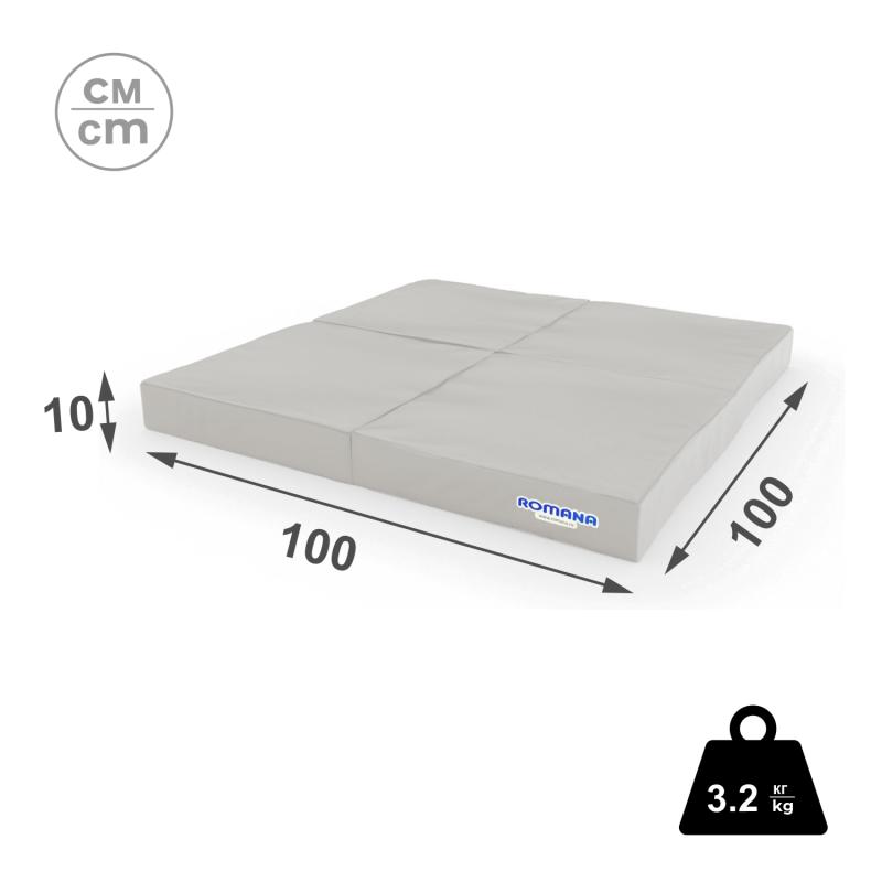 Габариты мата 1000*1000*100мм в разложенном виде. Коврик можно сложить разными способами, в два, три или четыре раза. В собранном виде мат компактен, его легко можно сложить и убрать после тренировки.