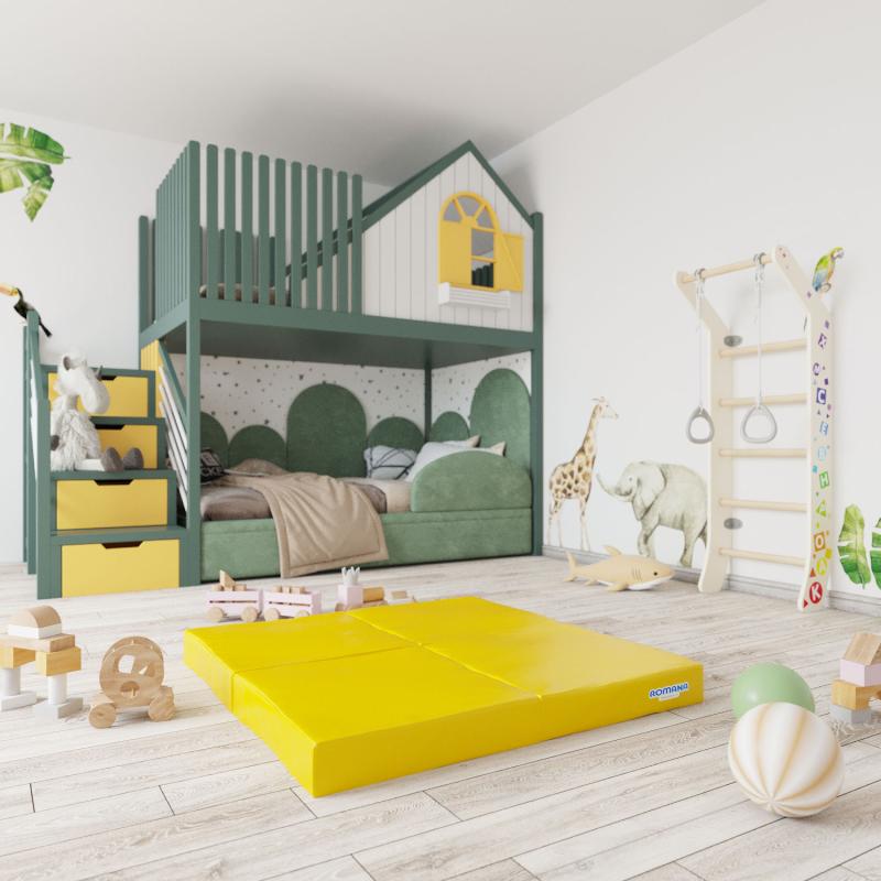 Компактный мат обеспечит безопасные условия во время физической активности. Матом можно укомплектовать шведскую стенку или использовать его, как спортивный инвентарь для домашних тренировок. Изделием можно дополнить детскую игровую зону, решая проблему холодного пола и обеспечивая комфортные условия для веселых игр. Секции мата сшиты между собой прочной тканью, что не позволяет им разъезжаться при эксплуатации.