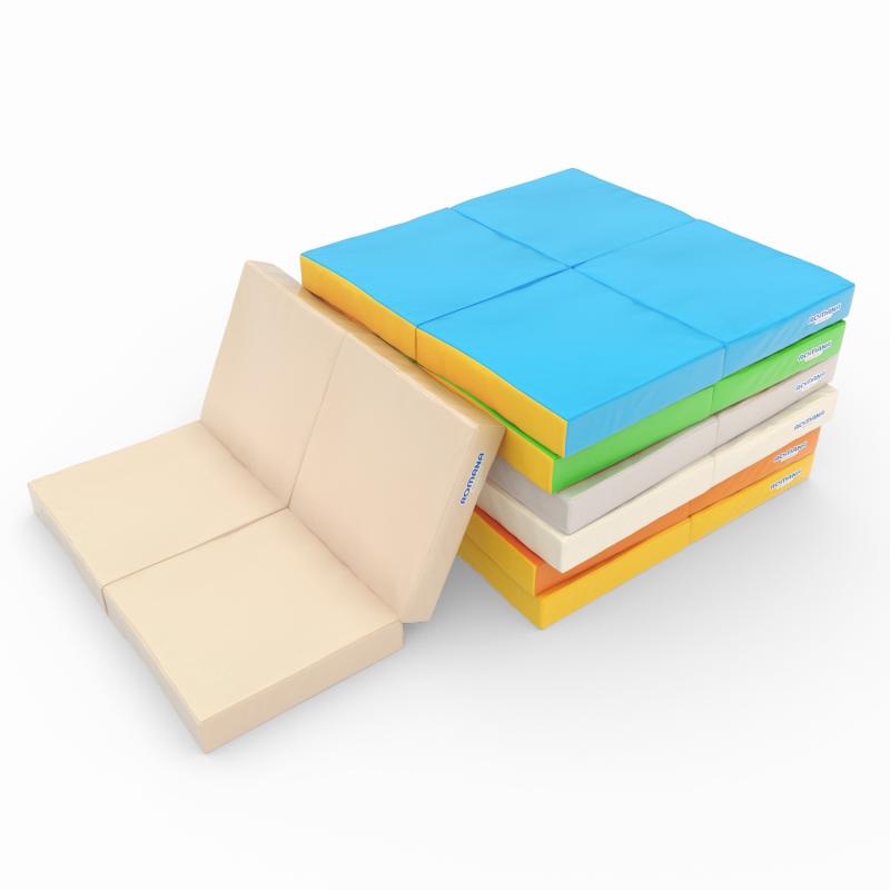 Уникальная конструкция изделия позволяет складывать его различными способами. Мат легко трансформируется в диванчик или кресло. В собранном виде мат компактен, изделие легко собирается и раскладывается.