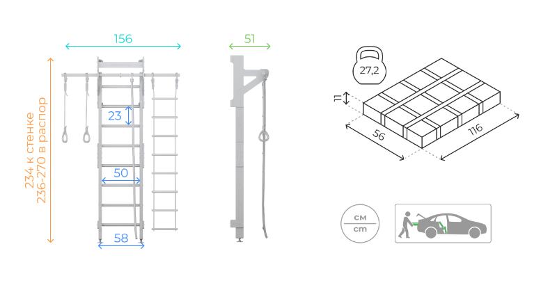 ДСК «Шведская стенка ROMANA Eco2.1» является более модернизированной версией модели деревянной шведской стенки. Для комплекса характерно два вида крепления (к стенке и враспор) и наличие навесного оборудования. Это расширенная версия с современным дизайном для использования в домашних условиях. Высота комплекса составляет до 2700 мм. Допустимая нагрузка до 100 кг, на навесное оборудование – до 50 кг.