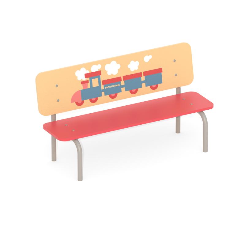 Скамья детская «Romana 302.09.00» двухцветная детская скамейка со спинкой для детских площадок, спортивных городков, детских садов. Спинка изделия декорирована рисунком «Поезд/день», выполненным «УФ»-печатью.