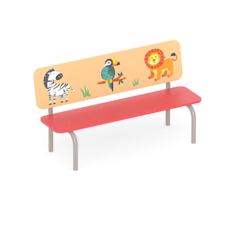 Скамья детская «Romana 302.09.00» двухцветная детская скамейка со спинкой для детских площадок, спортивных городков, детских садов. Спинка изделия декорирована рисунком «Зоо», выполненным «УФ»-печатью.