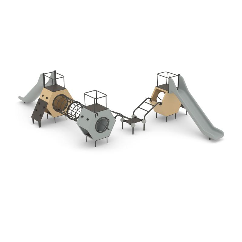 Игровой комплекс Romana 115.84.00 — многофункциональная площадка для детей 7-14 лет. Конструкция размером 9154 x 6503 x 2195 мм состоит из трех объемных шестигранников, соединенных переходами. Комплекс включает:
