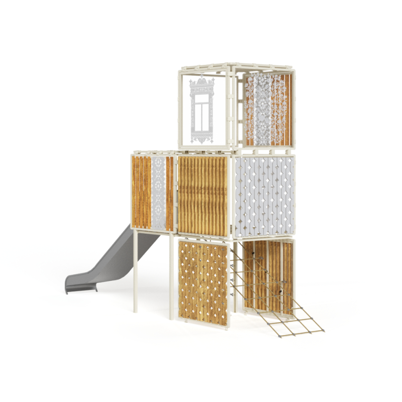 Каркас - металлопрокат сталь Ст3, покрытие - цинкосодержащий грунт, порошковая окраска (RAL по согласованию). Обшивка - дерево, покрытие - антисептик, масло террасное атмосферостойкое для древесины. Скаты - нержавеющая сталь. Панели HPL. Канатные сети, лазы, ограждения - канат армированный 16 мм. Декоративные части - монолитный поликарбонат не менее 3 мм.