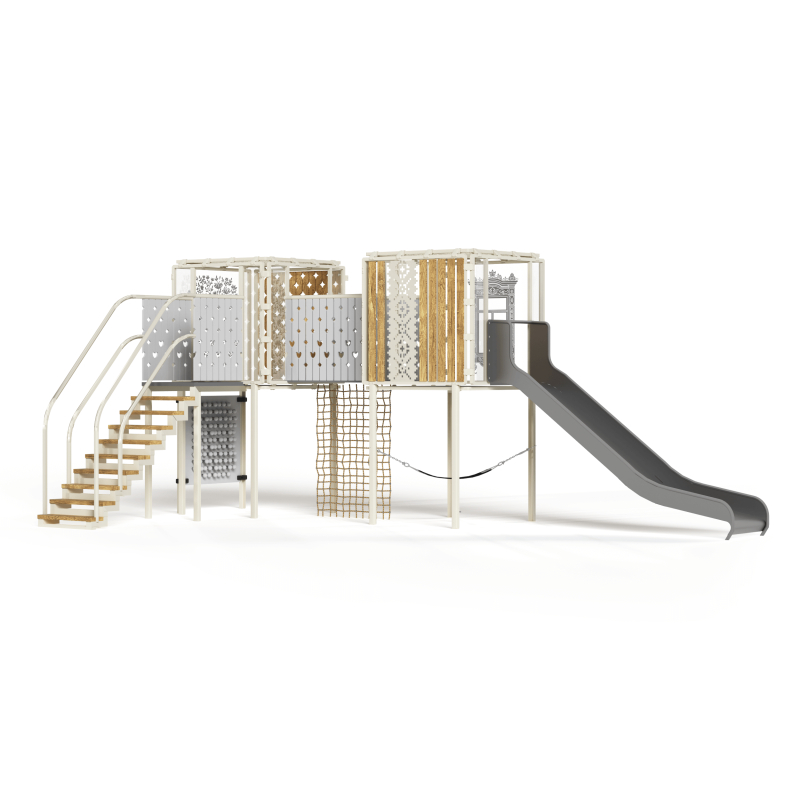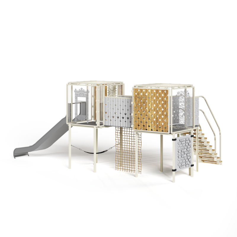 Каркас - металлопрокат сталь Ст3, покрытие - цинкосодержащий грунт, порошковая окраска (RAL по согласованию). Обшивка - дерево, покрытие - антисептик, масло террасное атмосферостойкое для древесины. Скаты - нержавеющая сталь. Панели HPL. Канатные сети, лазы, ограждения - канат армированный 16 мм. Декоративные части - монолитный поликарбонат не менее 3 мм.