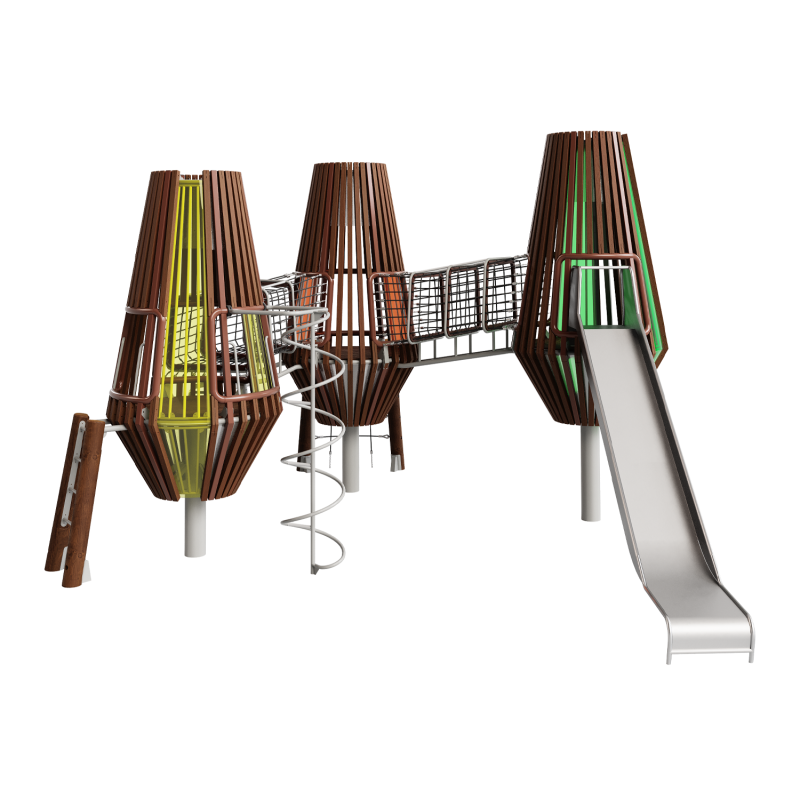 Каркас - металлопрокат сталь Ст3, покрытие - цинкосодержащий грунт, порошковая окраска (RAL по согласованию). Обшивка - дерево, покрытие - антисептик, масло террасное атмосферостойкое для древесины. Горки, скаты - сталь нержавеющая AISI 304 толщиной не менее 2 мм, шлифование и электрохимическая пассивация сварных швов. Канатные сети, лазы, ограждения - канат армированный 16 мм.ж