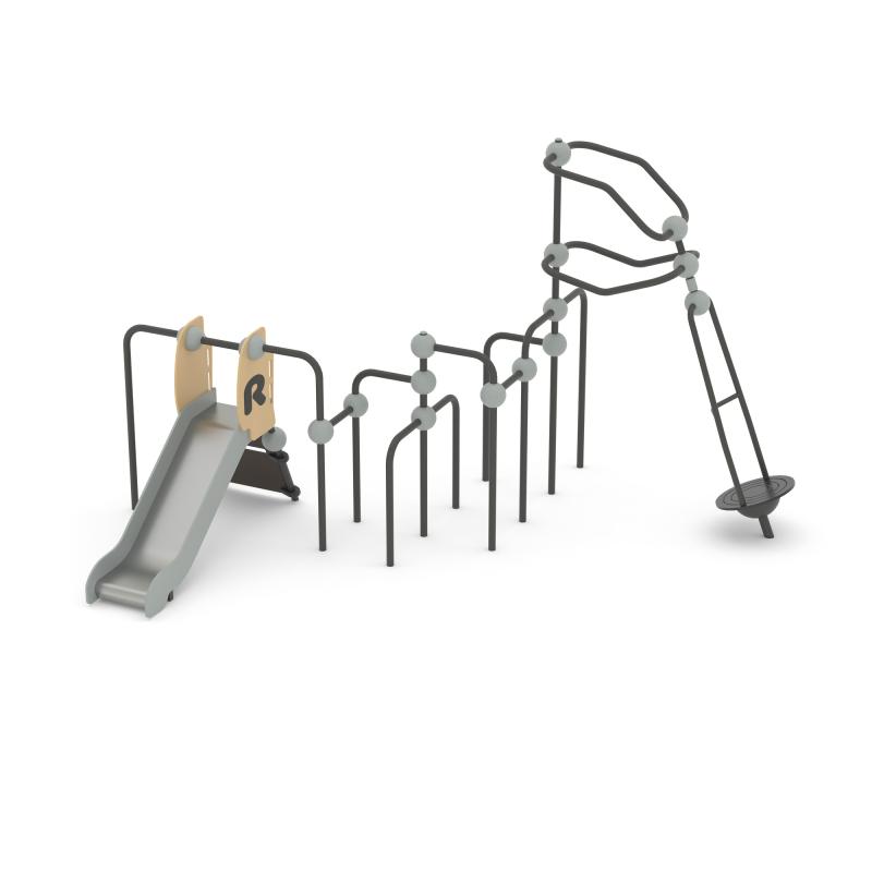 Конструкция обладает высокой ударопрочностью и виброустойчивостью. Во избежание травм и застревания одежды и частей тела, изделие разработано и изготовлено в соответствии с требованиями ГОСТ Р 52169-2012.Выполнен в виде металлических стоек из 057 трубы, соединенный шарами, имеется горка h=950 мм. и одноместная карусель.