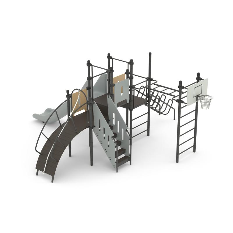 Игровой комплекс для тематических игр и физического развития предназначен для детей в возрасте от 8 лет. Изделие представляет собой сборно-разборную каркасную конструкцию из металлических труб, установленную на забетонированные стойки.Изделие устанавливается на открытых уличных участках, находящихся под контролем ответственного лица – эксплуатанта. Установка Изделия должна проводится на ровной площадке, свободной от насаждений. В зоне приземления должно быть ударопоглощающее покрытие (песок, древесные опилки) минимальной толщиной 300 мм.
