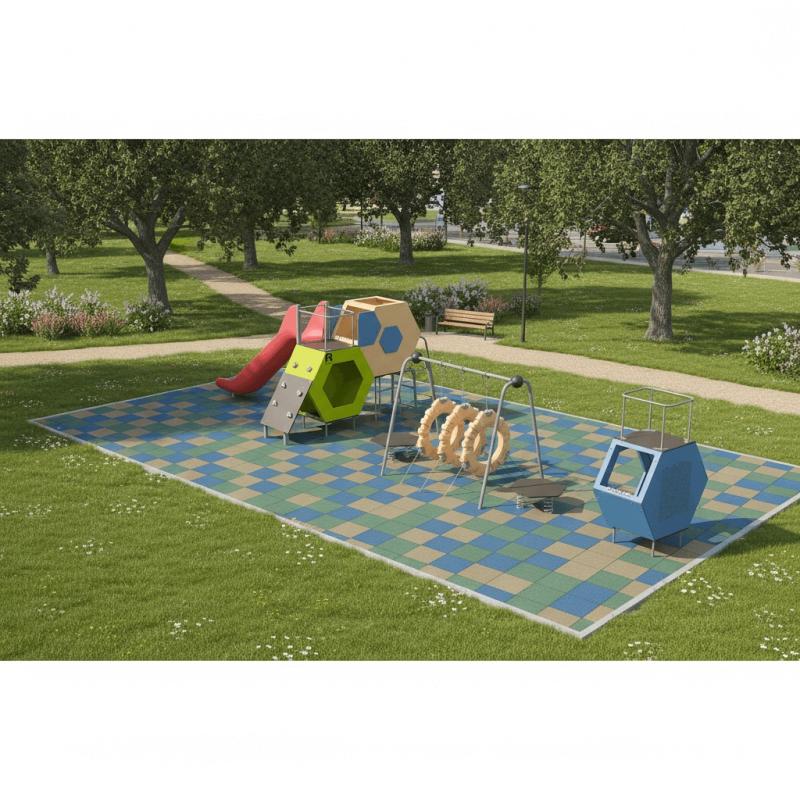 Детская площадка Romana – это игровой комплекс для улицы, который состоит из трех объемных шестигранников, связанных разнообразными переходами. Один из шестигранников оснащен увлекательными элементами – горкой и лазом, что делает площадку еще более интересной для детей. Переходы между шестигранниками созданы в виде игровых лазов со стойками, а для предотвращения травм и вандализма стыки защищены специальными сферами. Некоторые переходы работают по принципу батута, предоставляя детям возможность весело прыгать и развивать координацию. Для обеспечения безопасности предусмотрены ограждения, которые удобно обхватывать руками, обеспечивая надежную поддержку и защиту от падений. Все элементы комплекса, кроме ограждений и крепления горки, прочно закреплены на грунтозацепах, что гарантирует устойчивость и долговечность конструкции даже при активной эксплуатации.
