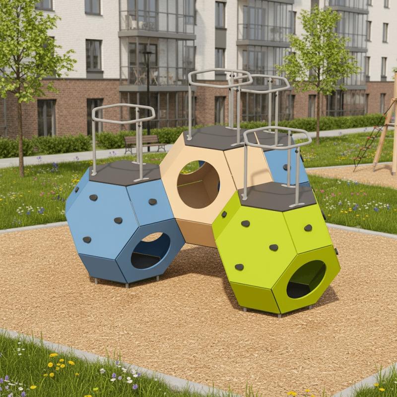 Игровой модуль для тематических игр и физического развития предназначен для детей в возрасте от 8 до 12 лет. Изделие должно представлять собой устойчивую конструкцию, обеспечивающую безопасные условия для занятий на открытом воздухе. Конструкция должна обладать высокой ударопрочностью и виброустойчивостью.В сборе представляет собой конструкцию в виде четырех игровых элементов в виде «усеченного октаэдра», один из которых располагается выше, а остальные три присоединены к шестигранной панели и расположены в плане под углом 120 градусов. Три нижних элемента установлены на грунтозацепы.