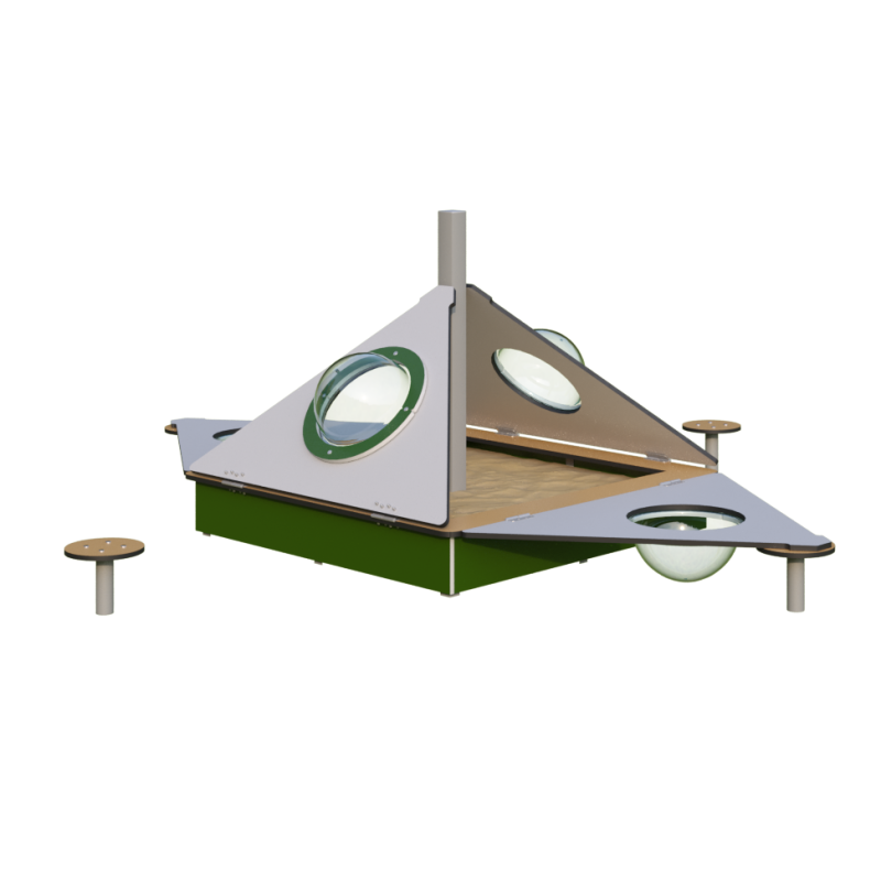Песочница соответствует требованиям ГОСТ Р 52169-2012 по безопасности. Крышки защищают песок от загрязнений и могут использоваться как игровые столики. Прозрачные полусферы стимулируют любознательность детей. Конструкция способствует развитию моторики, социальных навыков и творческого мышления. Высота свободного падения — 218 мм. Модель подходит для детских садов, парков и дворовых территорий.