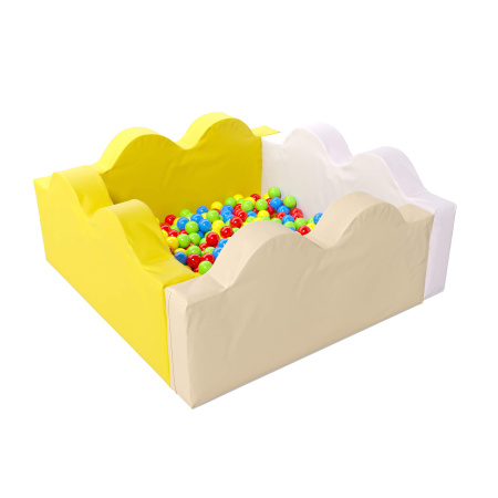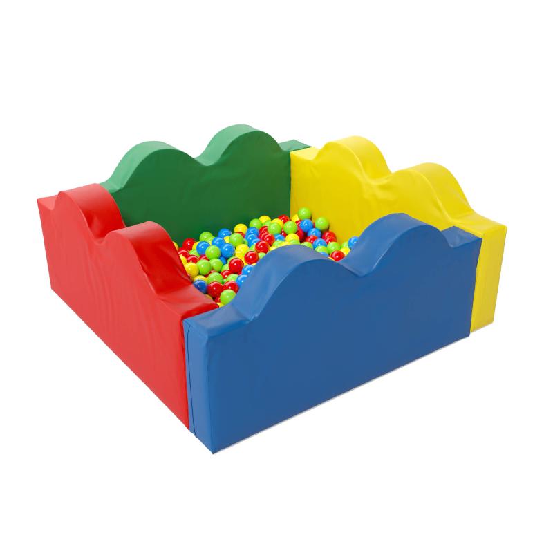 Сухой бассейн с шариками «Волна» - необычный бассейн с волнистыми бортами для детской комнаты или дачного участка. Сухой бассейн собирается из отдельных элементов, которые крепятся друг к другу с помощью липучек. Мягкие бортики в форме волн и такой же мягкий мат, выполняющий роль дна, обеспечивают малышу полный комфорт и безопасность во время игры. Дно и стенки бассейна, изготовлены из поролона и обтянуты качественной износостойкой винилискожей. Вместо воды такой резервуар заполняется пластмассовыми шариками (входят в комплектацию 300 шариков), «плавая» в которых дети развивают координацию движений, мелкую моторику и получают полезный расслабляющий массаж всего тела. Помогает малышу развивать мелкую моторику, знакомиться с цветами и объёмами предметов. Габаритные размеры 1400 х 1400 x 400 мм. Отлично моется. Вес с упаковкой 12,5 кг.